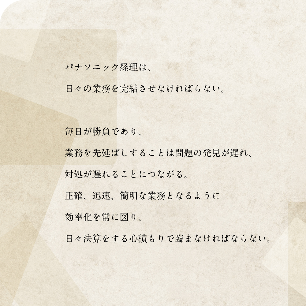 パナソニック経理は、収益力や資金の創出力を向上等の経営体質強化のために積極的に提案し、合理的な経営目標の設定と強力な推進に貢献すると同時に、財務の健全化にも取り組まなければならない。